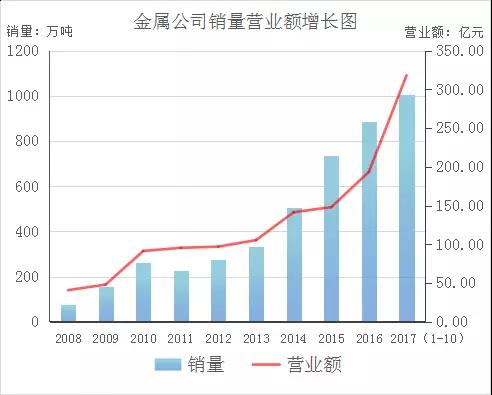 2017年1-10月,廈門建發(fā)金屬有限公司銷量首破千萬噸,達1003.8萬噸,營業(yè)額318億,同比增長分別為46%和123%,近10年年復(fù)合增長率約30%。